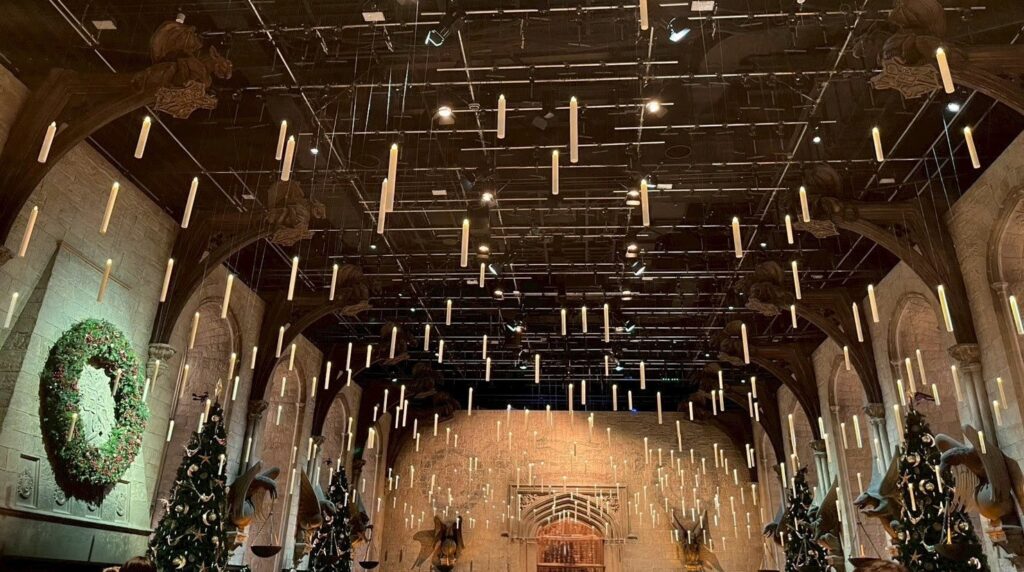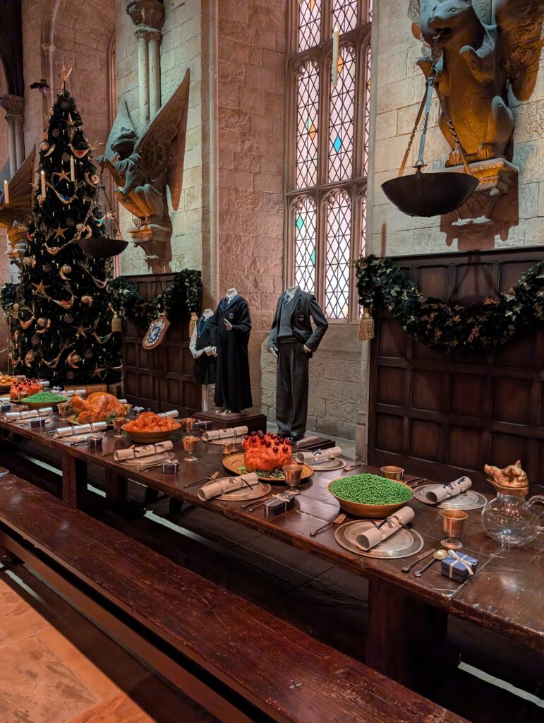 まずはやはり大広間でしょうか。ここを見るだけでもスタジオツアーに来て良かったと思えるほどです。実際の場面では暗くなっているところから明るくなるのでより感動が増します。私が行ったときはちょうどホグワーツインザスノウという冬のイベント時だったのでクリスマスツリーなども飾りつけされていました。