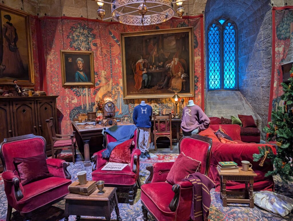 太った婦人の脇にはグリフィンドール寮の談話室があります。映画でも登場頻度が多いためここなら知っているという方も多いのではないのでしょうか?太った婦人の脇にあるというのがまたファンには嬉しい配置です。見るからにフカフカで座り心地がよさそうなソファですが、座ったり、触ったりするのはNGです。それにしてもすごい再現度です。横にはクリスマスツリーもあり、透明マントが入っている包みらしきものもありました。実際に見るとサイズ感なども楽しむことができますね。