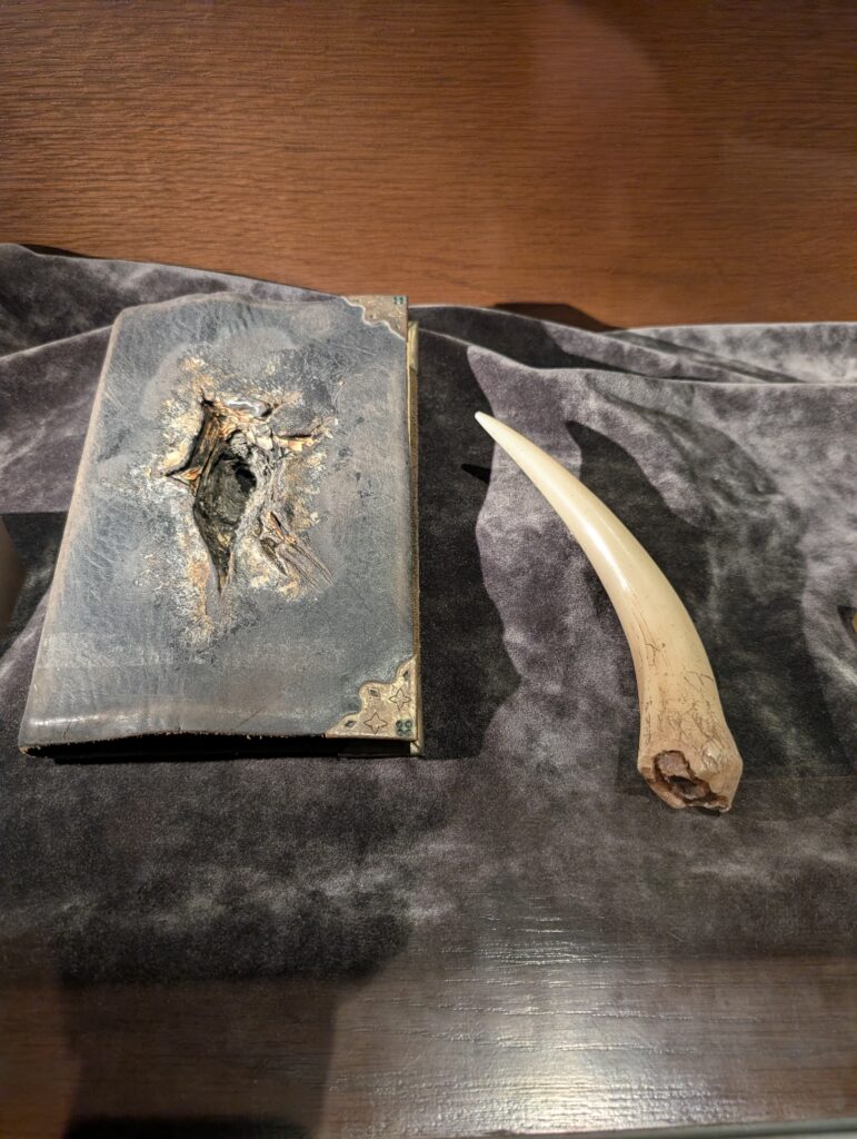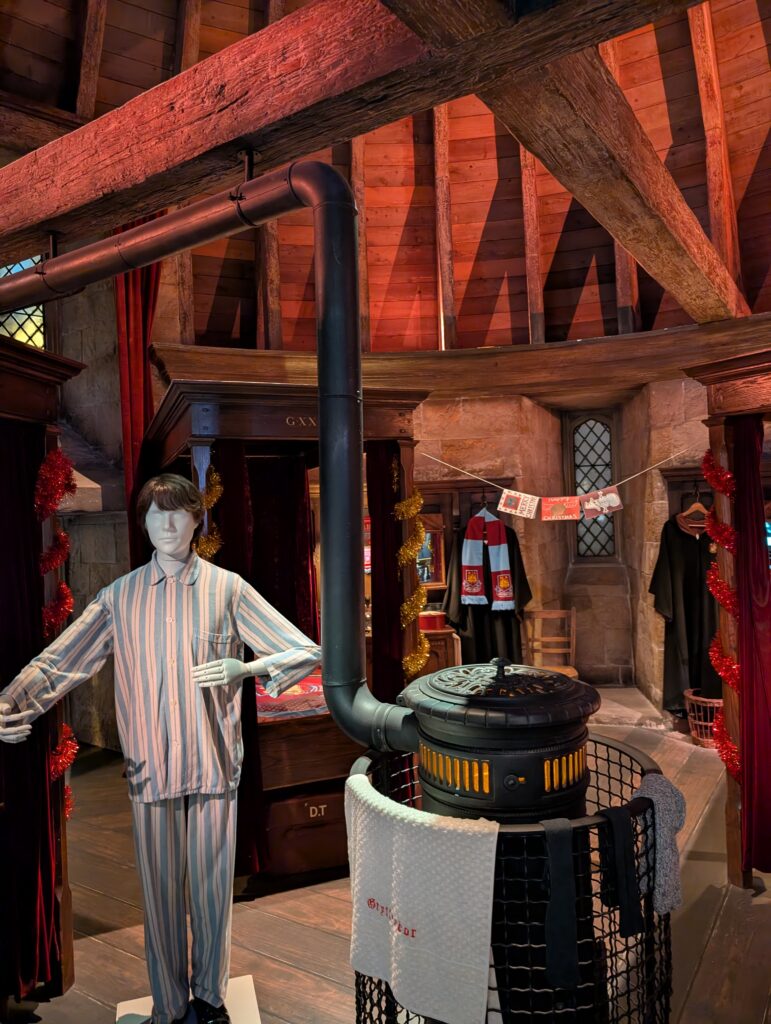 寝室もあります。冬なのでストーブがあるのか、タオルを乾かしていたり、ローブをかけていたり、トランクがあったりと生活感が伺えました。天蓋付きベッドいいですよね。ベッドのサイズは思ったよりも小さく感じました。D.Tとはディーン・トーマスでしょうか?