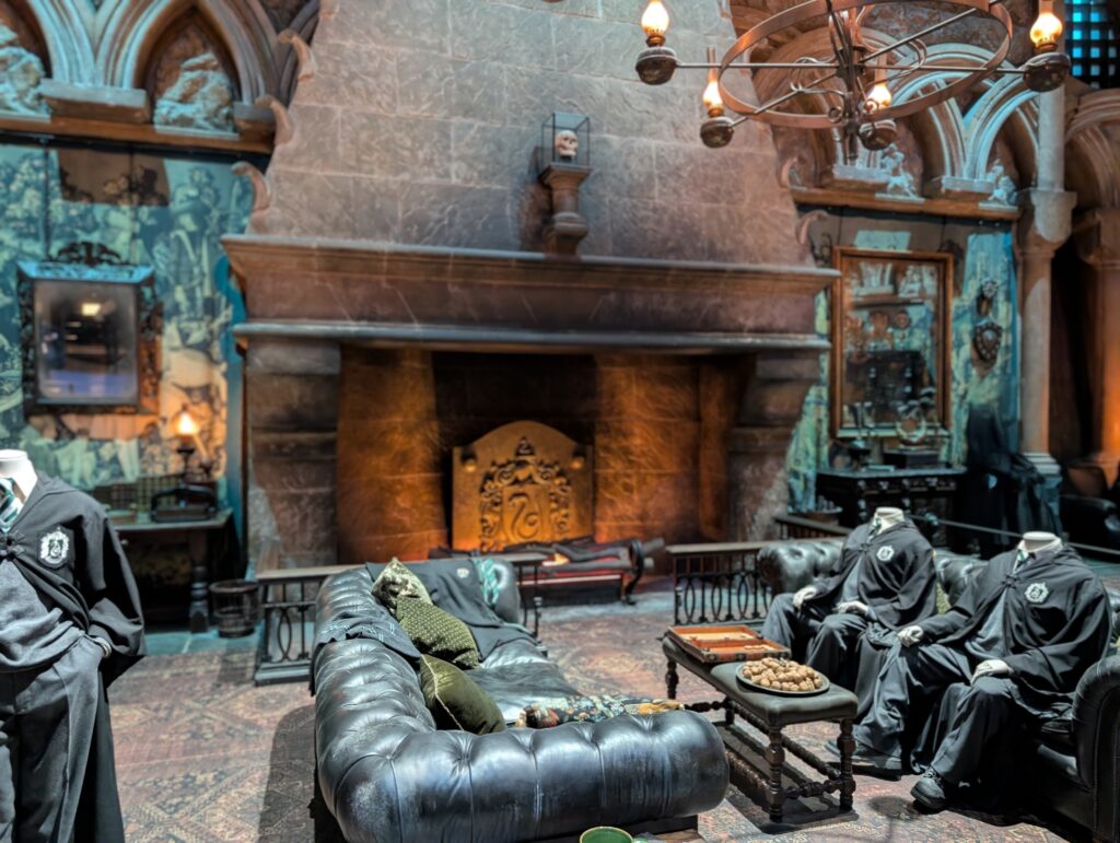こちらはスリザリン寮の談話室です。グリフィンドールとは打って変わって暗く、陰鬱な感じです。大きい暖炉の奥にある蛇のマークがいいですね。暖炉の上のドクロは一体…