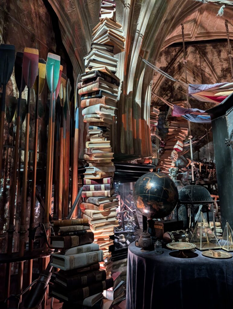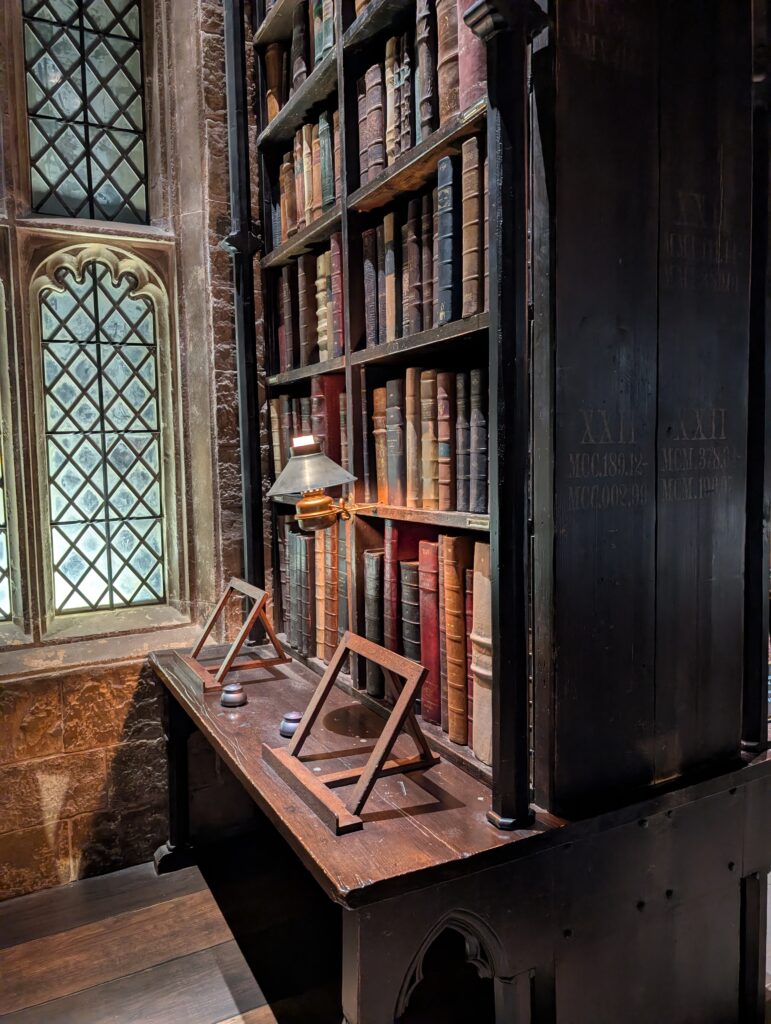 図書室です。エリア的には少しだけでしたが、雰囲気や本を読む台も相まって知的な雰囲気の写真を撮ることができます。机の汚れ具合もいいです。映画ではハーマイオニーがよく利用していたイメージです。