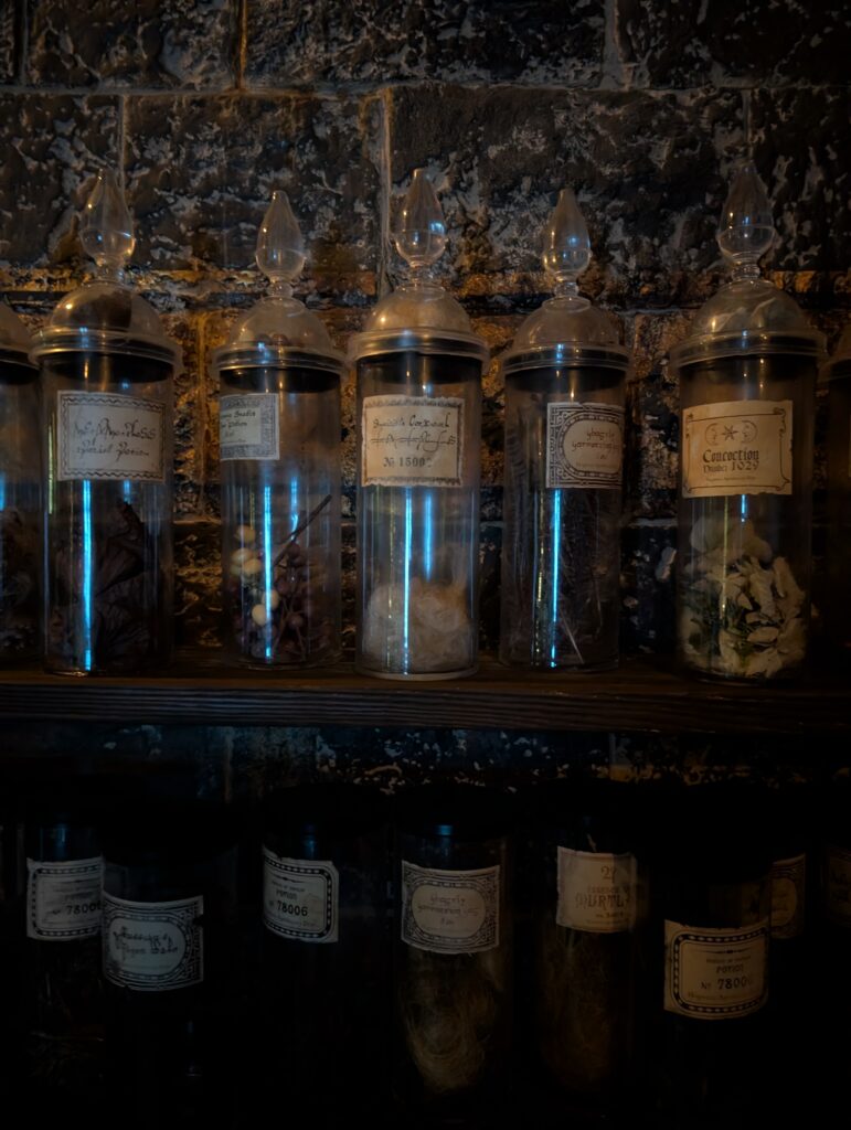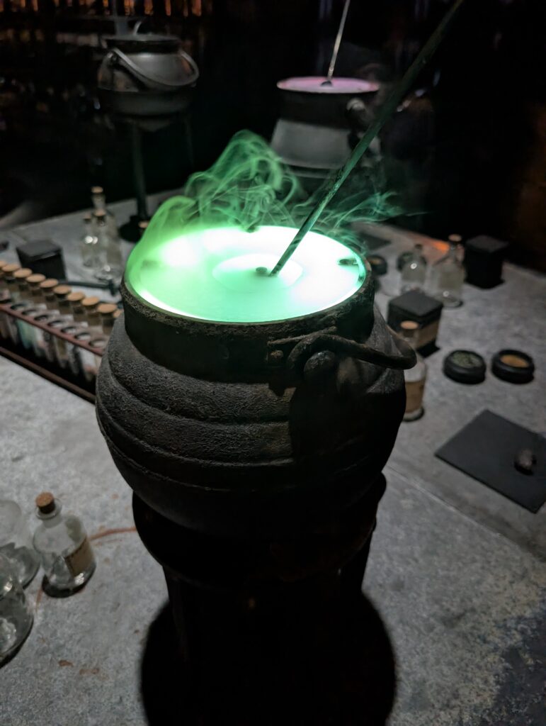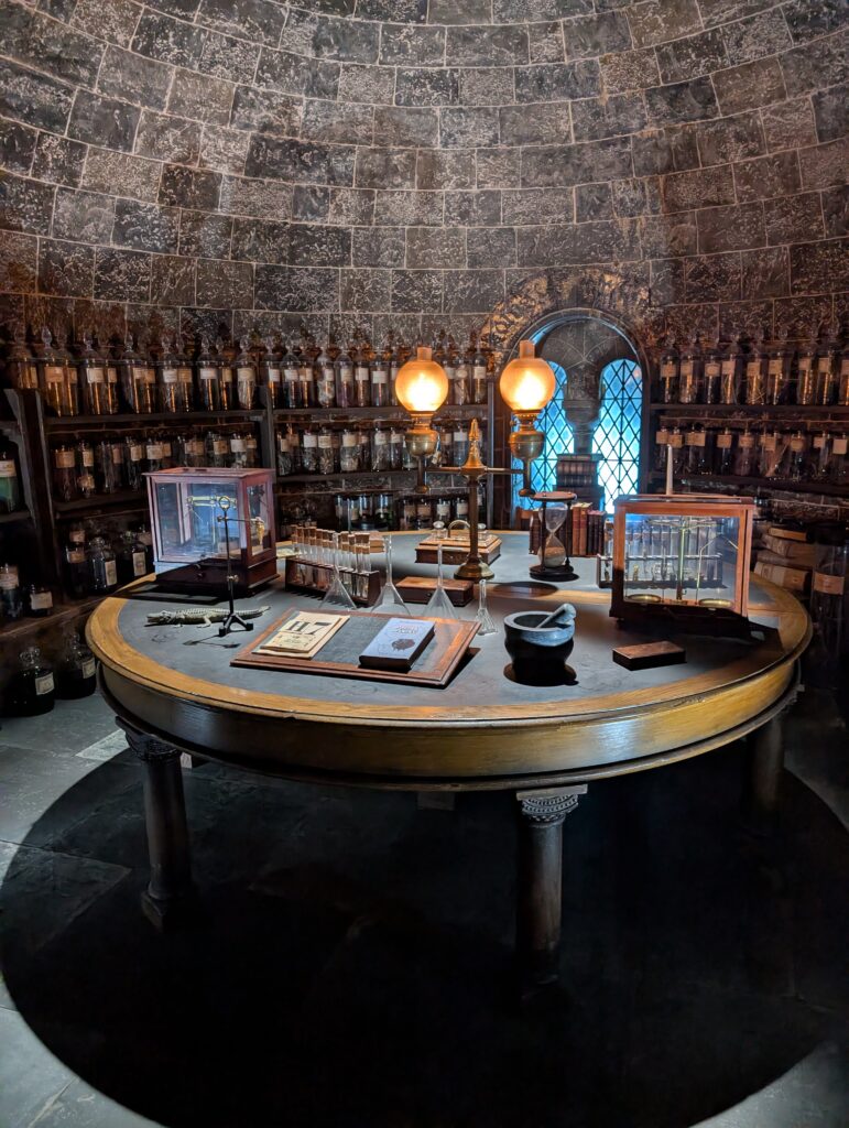 魔法薬学の教室です。素晴らしい雰囲気ですね。ちゃんと怪しげな薬の材料も瓶詰で置いてあります。鍋の中では怪しげな薬がぶくぶくと煙を吹いていました。鍋の前に立つと本当に調合している雰囲気になります。触りたくなりますが、備品類には触ってはだめですよ。