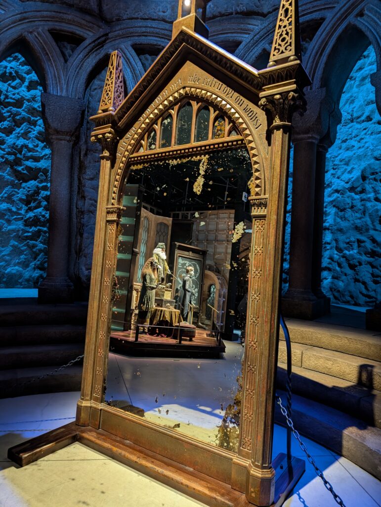 みぞの鏡です。見る人の心の底からの願いを映し出すと言われている魔法の鏡です。鏡の前に立ち、写真撮影することができました。思わず目の前で座ってみたくなりますが、結構写真の列ができていたので立って撮影しました。映画のハリーは両親の姿が見えていましたがあなたには何が見えるでしょうか?