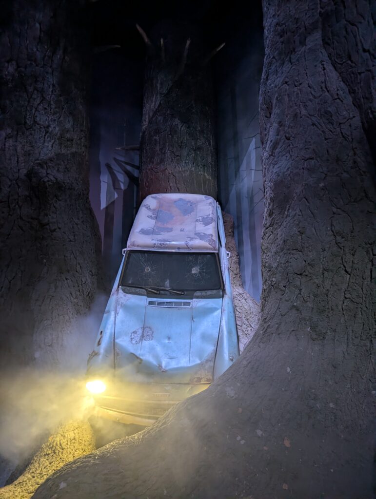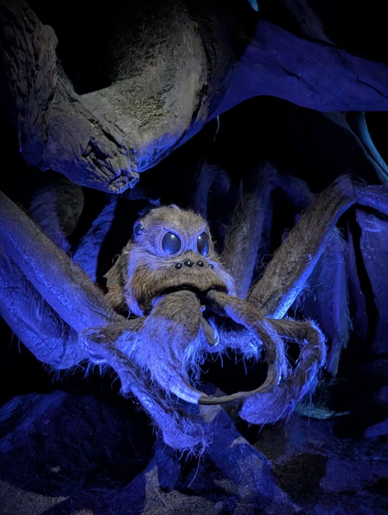 禁じられた森です。エリア内は霧がかかったような感じでヒヤリとしており、また、地面の感触も土を踏んでいるかのようで、より没入感が増します。森の番人であるハグリッドやバックビーク、そのお友達のアラゴグ、ハリーとロンが墜落させた車(空飛ぶフォードアングリア)もありました。車のところではエンジン音がかかるなど、相変わらず演出が細かいです。森といえばエクスペクトパトローナム!守護霊呪文が有名ですが、もちろんその体験ゾーンもありました。是非体験してみてください。
