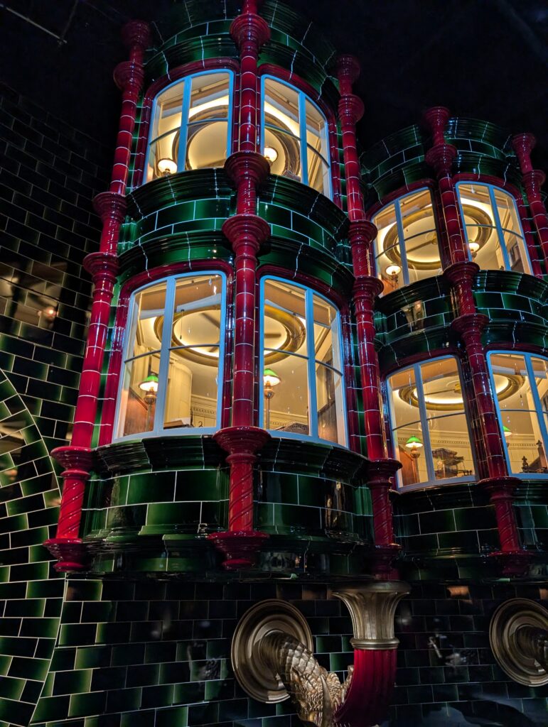 魔法省です。電話ボックスから入るあれです。映画終盤の魔法省は魔法使い至上主義を掲げるヴォルデモートに乗っ取られており、MAGIC IS MIGHT(魔法は力なり)と書かれた石造の下にマグル(魔法使いではない、非魔法使い)が押しつぶされているというとんでもコンセプトです。ヴォルデモートの考え方がよく表れていますね。