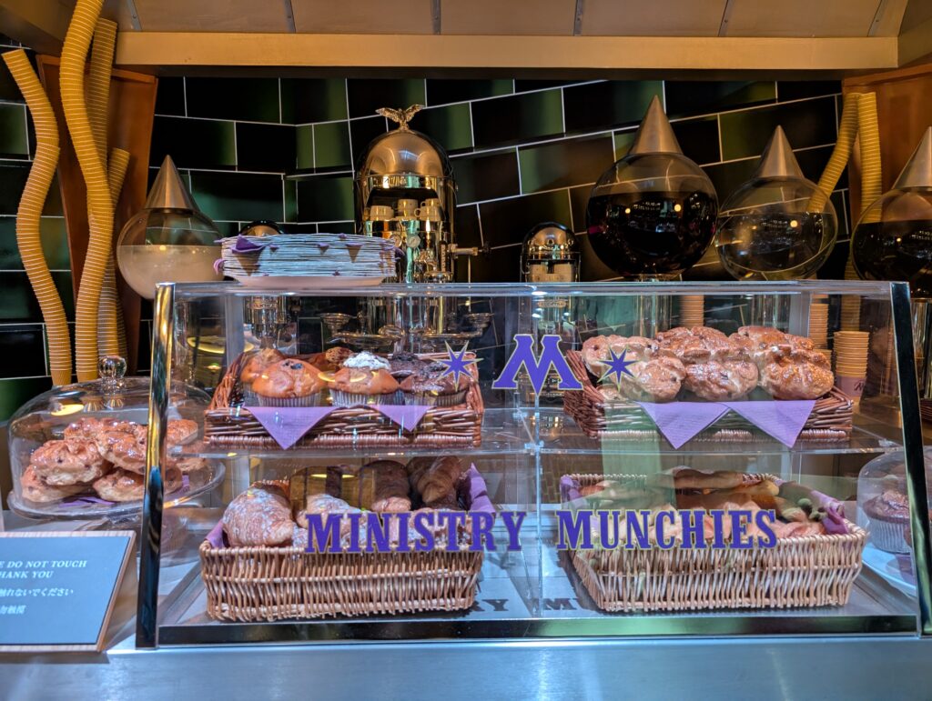 乗っ取られているとはいえ、魔法省ゾーンに入るとやはり圧巻です。魔法省職員が仕事している室内には入ることはできませんが、中も作りこまれており、また、実際に売ったり、食べられるわけではありませんが、売店コーナーなどもあったりして楽しいです。ヴォルデモートに乗っ取られているということは敵は当然ハリーポッターになるわけで、ハリーの手配書なども貼ってあるなど細かいですね。魔法省内では連絡は紙飛行機を飛ばして取り合うことが多かったそうです。(ふくろうだと糞が多いとかなんとか)それにしても売店の食べ物がおいしそうです。