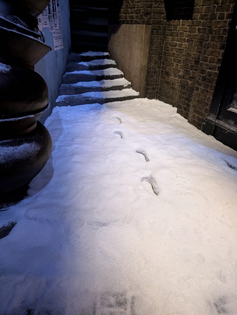 ダイアゴン横丁です。雪化粧もしており、雰囲気が抜群にいいです。お店の中は入れないですが、一軒一軒外から見るだけでも楽しいです。いつか入ることができたらいいなぁ。ハリーが透明マントを使ったのか雪の中に足跡だけがあったりなど、遊び心も楽しいですね。ダイアゴン横丁の端から端まで映るようにとるとめちゃくちゃいい感じになりますが、人が多いので難しそうです。